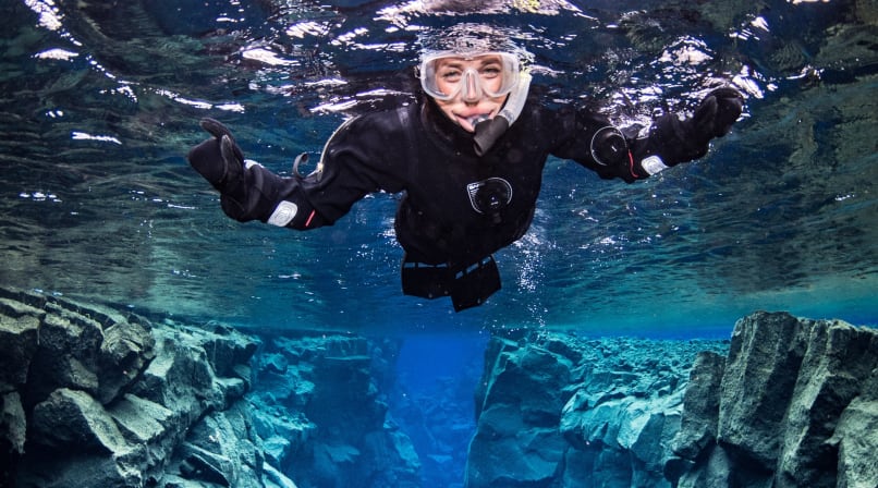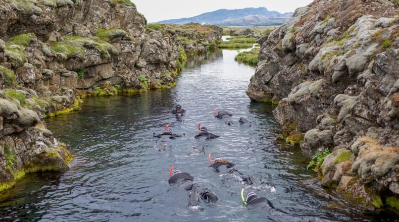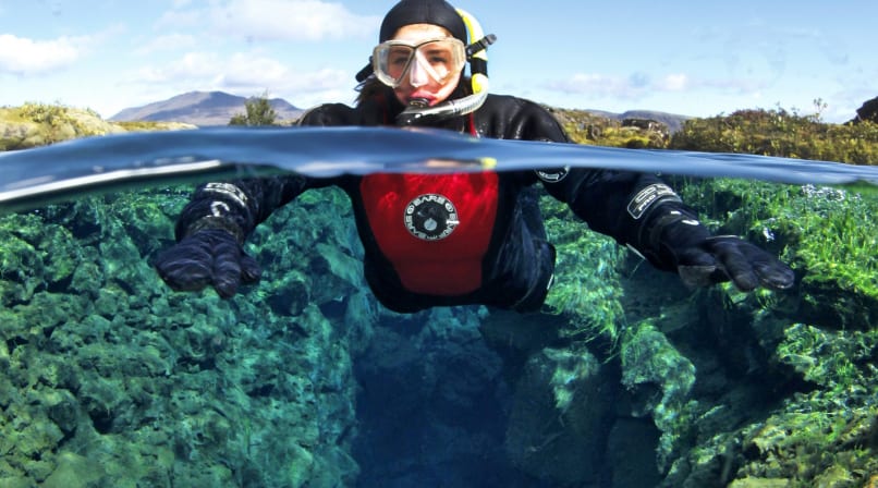On the snorkeling tour we will dress you in a dry suit and guide you through the four parts of the Silfra fissure. Floating through Silfra's crystal clear water is an otherworldly experience; the near-freezing water, astonishing colors, and sensations of flying provide a very unique environment for liquid meditation that you will never forget.