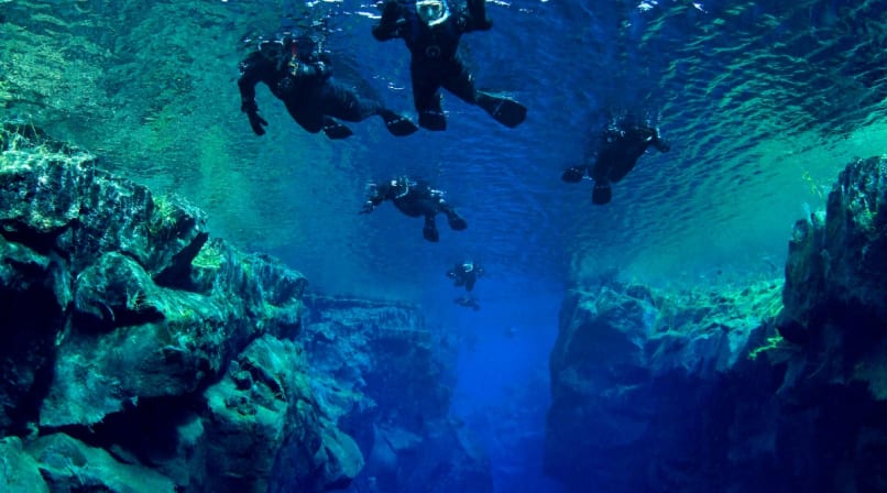 Silfra is a fissure between the North American and Eurasian continental plates. Silfra constantly fills with glacial water that has been trickling through underground lava rock for 30 years. This remarkable crack between two tectonic plates is therefore filled with the clearest water on our planet, allowing for over 100 meters visibility.